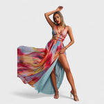 Das gemalte Maxi-Kleid von Freya macht mit seiner fliessenden Silhouette und dem lebhaften Aquarell-Design einen unvergesslichen Auftritt. Perfekt für Strandabende, tropische Urlaube oder jeden Moment, der nach trendiger Eleganz verlangt.