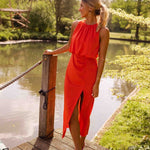 Lass deine sommerliche Eleganz mit dem Maria Midikleid mit hohem Kragen und eleganten seitlichen Schlitzen sprechen!