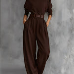 Das Set Maria vereint subtile, moderne Raffinesse mit Alltagskomfort. Es besteht aus einem minimalistischen Top mit Rollkragen und Hosen mit geradem Bein, die die Silhouette auf natürliche und elegante Weise betonen. Es ist vielseitig und stilvoll – ideal für die Arbeit, einen Stadtbummel oder einen ruhigen Abendspaziergang.